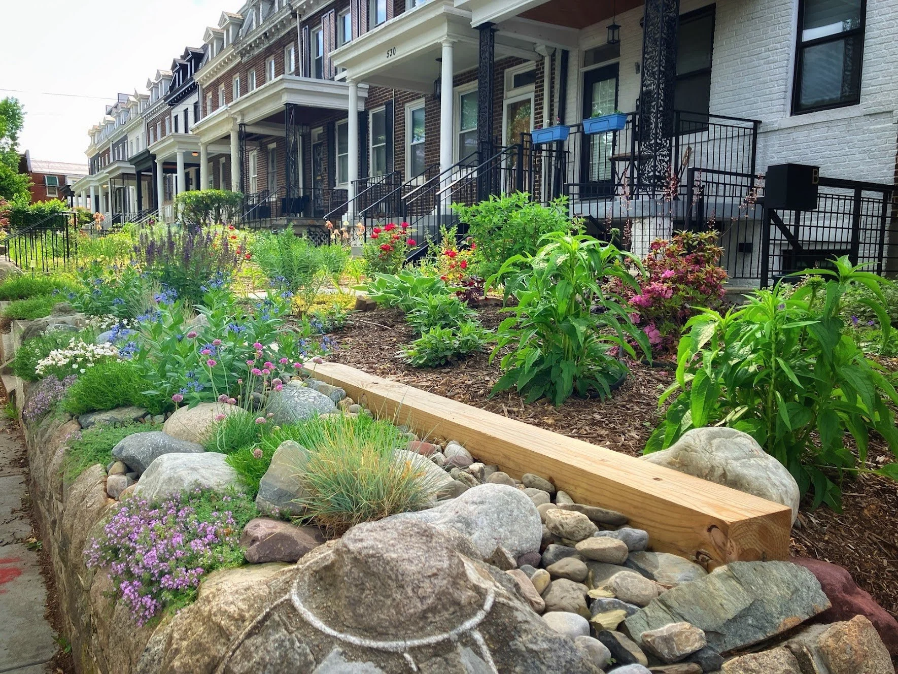 Design plans for this DC space revitalized a spacious backyard characterized by extensive lawn, underutilized areas, and fragmented plantings. It included re-grading the yard edges, refreshing the front yard planting, introducing a walkway through a rejuvenated garden of native plants, and a shade garden area.
