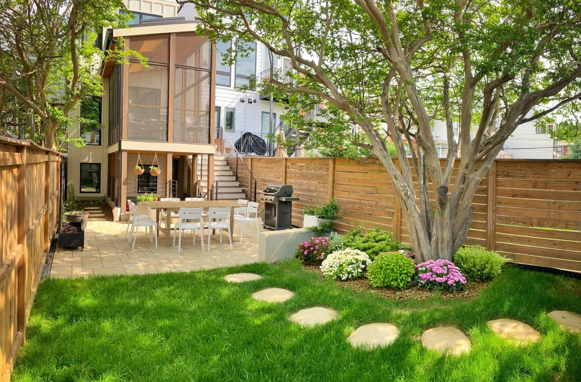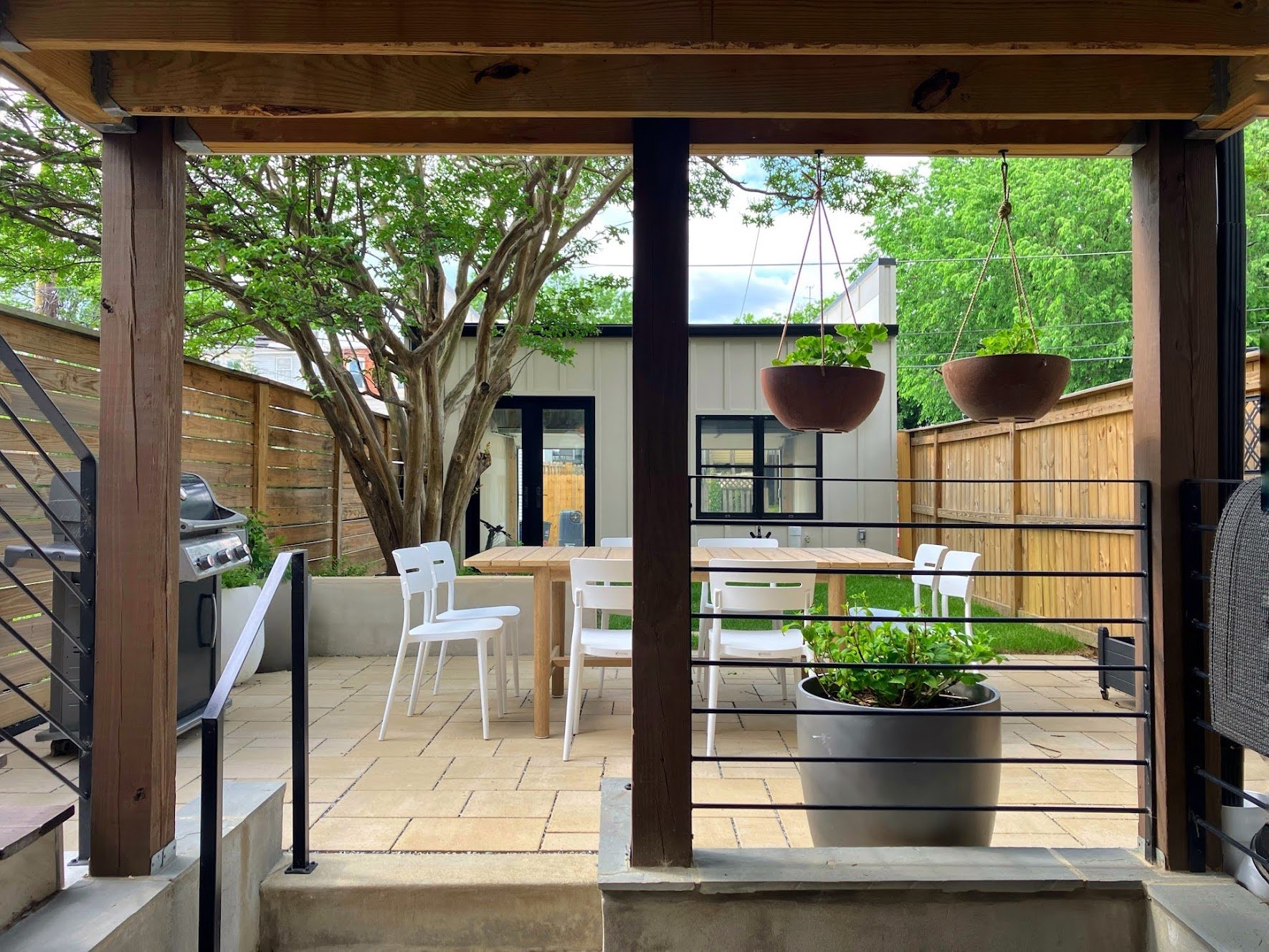 Starting from the top, this DC rowhouse had a sky view but not much more than that. A natural wood enclosure created a whole new outdoor room, complete with hanging planters to customize throughout the seasons. In the backyard, a new brick patio, refreshed gardens, a sleek fountain, and repurposed elements were added to the shade trees and their natural cover to upgrade this urban retreat.
